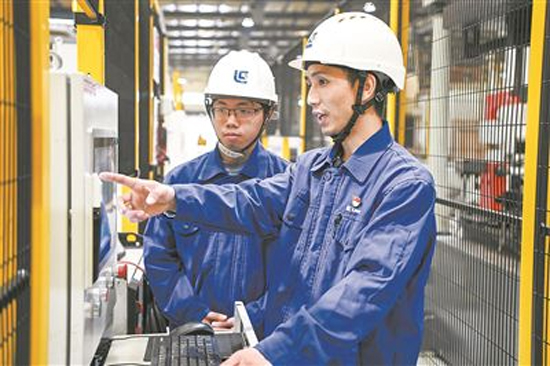 周穎峰是廣西柳工機械股份有限公司的一名數控車工高級技師。作為新當選的全國人大代表,周穎峰表示他更關注的是在傳統制造業轉型升級過程中,一線的產業工人如何跟上時代步伐,為中國先進制造業發展貢獻智慧和力量。圖為2月14日在廣西柳工機械股份有限公司的生產車間內,周穎峰(右)給徒弟講解數控設備操作細節。 新華社記者 曹祎銘攝