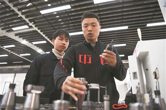 2017年,楊登輝代表中國參加第44屆世界技能大賽,奪得數控銑項目金牌,并獲國家最佳選手獎。作為全國人大代表,楊登輝一直關注技工教育、技能人才等內容。圖為2月14日在廣東省機械技師學院模具工程項目集訓基地,楊登輝(右)為實習學生講解不同刀頭的作用。新華社記者 鄧華攝
