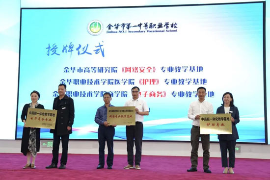 啟動儀式上,金華高等研究院網絡空間安全研究所、金華職業技術學院商學院、金華職業技術學院醫學院相關領導還和學校領導共同為金華市第一中等職業學校網絡安全專業教學基地、護理專業教學基地、電子商務專業教學基地授牌。