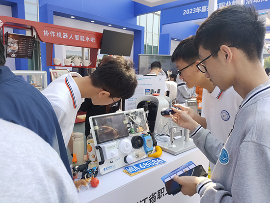 以浙江省“雙高”專業為主題的學校展位上,長三角物聯網與智能傳感產業學院合作單位華航唯實帶來的協作機器人智能水吧體驗項目正在展示茶功夫、咖啡沖泡、自動售賣、蛋糕裱花等技能,可愛的服務機器人與體驗嘉賓有趣對話,逗得大家哈哈大笑。