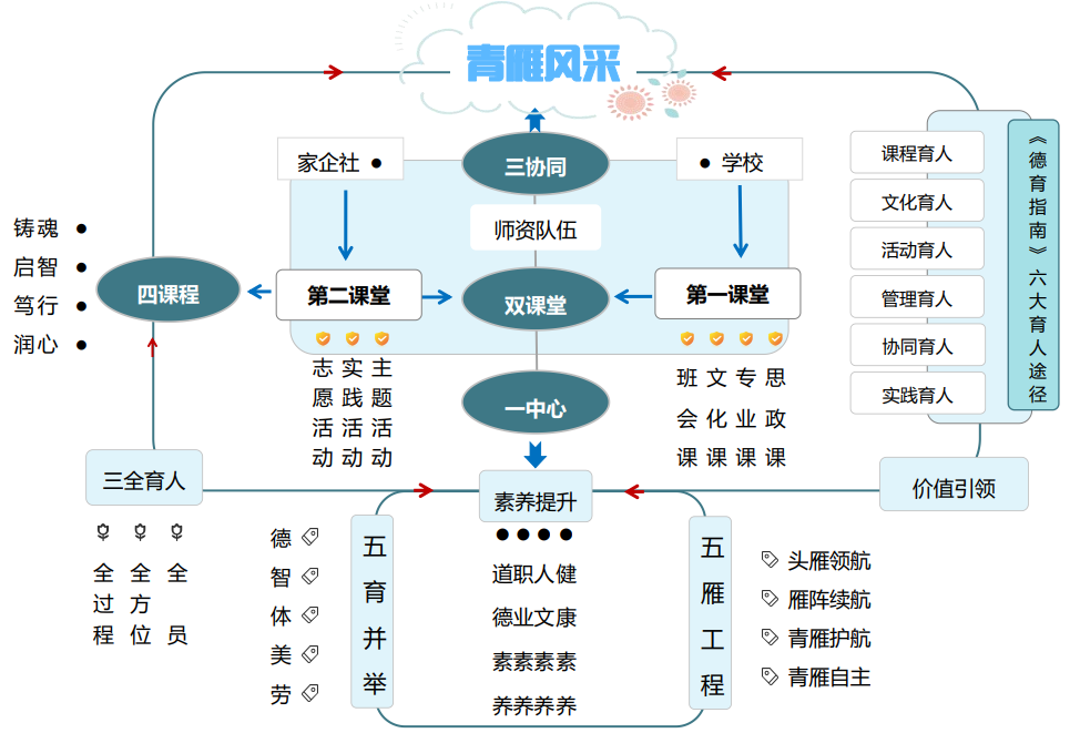 雙課堂:立足于第一課堂、第二課堂教育教學主陣地,發揮思政課程、課程思政、活動課程作用,實現學生素養培育的增效作用,展青雁風采。