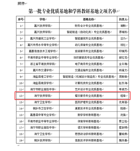 舊朝歲月隨風逝,新載希望翹首來。2023年12月末,根據(jù)嘉興教育局文件嘉教職成〔2023〕205號《關(guān)于公布嘉興市中等職業(yè)教育第一批專業(yè)優(yōu)質(zhì)基地和學科教研基地立項名單的通知》,海寧技師學院烹飪專業(yè)立項嘉興市中職學校第一批“專業(yè)優(yōu)質(zhì)基地”,不僅成為學院唯一一個立項“專業(yè)優(yōu)質(zhì)基地”的專業(yè),也是嘉興市中職學校烹飪專業(yè)中唯一一個立項的學校。