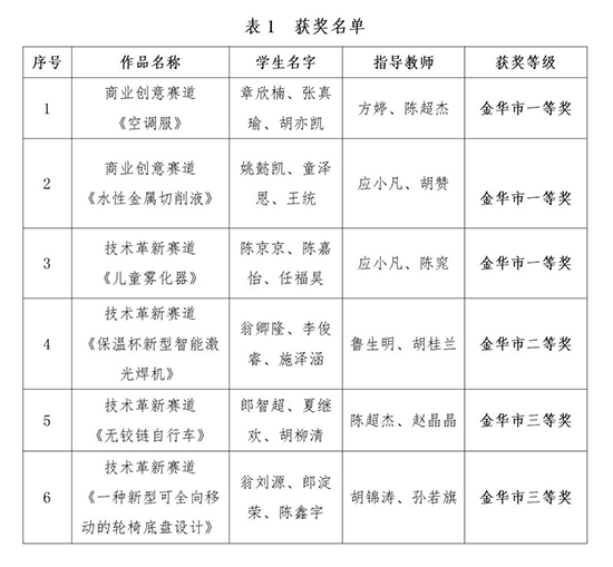 2023年12月28日,由金華市教育教學研究中心組織的2023年金華市中職學校創新創業大賽暨省賽選拔賽成績揭曉。永康職技校報送的6件作品全部獲獎,主要涉及技術革新與商業創意兩個賽項,最終獲金華市一等獎3項、二等獎1項、三等獎2項,創造該賽事歷史最佳成績。