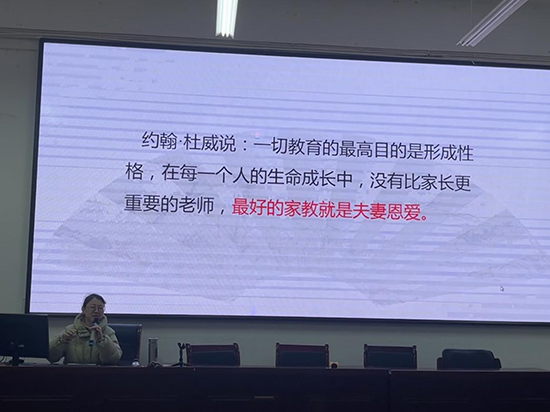 政教處副主任蔡章紅首先強調了夫妻恩愛對家庭教育的積極影響,圍繞幸福婚姻需要的兩種能力:發(fā)展出能夠處理沖突的能力和發(fā)展友情的能力展開,通過心理工作經驗幫助教師們認識到夫妻關系對于孩子成長過程中的至關重要性,從而增強教師關注和參與學生家庭教育的能力。