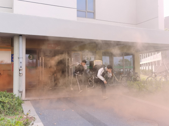 下午1時05分,宿舍區發生火情,消防警報響起,演練正式開始。各樓老師迅速到達指定點位,火情越來越嚴重,濃煙滾滾,同學們手捂口鼻、低頭彎腰,奔向寢室門口,按照預定疏散路線有序撤離出宿舍樓。在疏散過程中,大家安靜、快速、有序撤離,沒有出現擁擠、推搡、踩踏等意外情況。