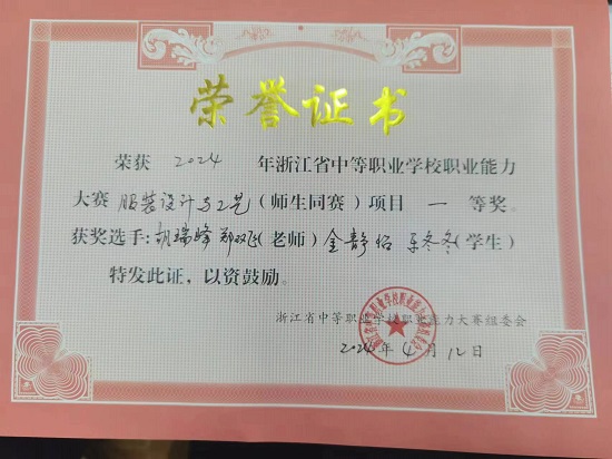 在4月11日至12日舉辦的2024年浙江省中等職業(yè)學(xué)校職業(yè)能力大賽“服裝設(shè)計與工藝”(師生同賽)項目比賽中,由北侖職高服裝專業(yè)教師胡瑞峰、鄭雙飛,21級服裝中高班學(xué)生金靜怡、樂冬冬組成的北侖職高代表隊,經(jīng)過激烈角逐,以絕對優(yōu)勢獲得大賽第一名。