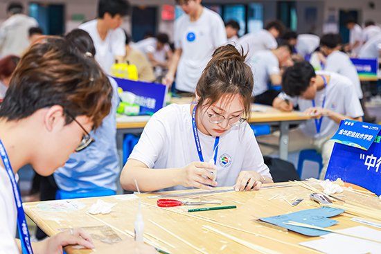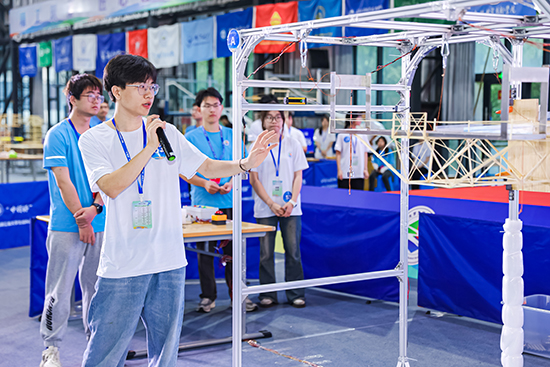 本屆大賽以“懸挑觀景平臺(tái)結(jié)構(gòu)設(shè)計(jì)與模型制作”為選題,包含理論方案、模型制作、陳述與答辯、加載試驗(yàn)等環(huán)節(jié)。參賽選手們制作的模型由不超過(guò)105根竹材制作而成,竹材厚度1毫米、寬度2—6毫米和長(zhǎng)度不超過(guò)900毫米,整體約重100—300克,能承受模型自重的50倍荷載。大賽用三個(gè)鋼球來(lái)模擬人群荷載,在4分鐘的加載時(shí)間內(nèi),當(dāng)模型出現(xiàn)結(jié)構(gòu)整體垮塌,或模型發(fā)生位移、測(cè)試報(bào)警器響起,或加載過(guò)程中任意小鋼球滾出觀景平臺(tái)道板,均視為模型加載失敗,加載過(guò)程驚險(xiǎn)又刺激。
