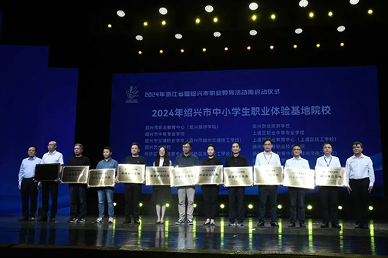 啟動儀式上,領導們為紹興市中小學職業體驗基地進行授牌。柯橋區職業教育中心成功入選。鐘建康書記代表學校上臺接受授牌。