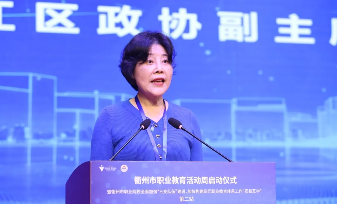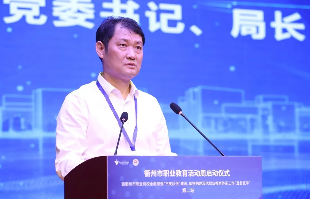 衢州市教育局黨委書記、局長季根壽指出,推動職業教育高質量發展,我們有基礎、有能力。近年來,衢州市職業教育認真貫徹落實中央、省、市決策部署,在市委、市政府的堅強領導下,堅定不移走改革牽引特色發展之路,取得了長足進步。讓每一位職教學子人生更出彩,我們有信心、有底氣。我們將以此次活動周為契機和新起點,立足產業所需所求,著力打造一批具有全省乃至全國影響力的市域產教聯合體。立足教育所能所向,切實提高職業教育適應性和吸引力。立足學生所想所愿,力爭讓每一個職教學子“未來有通道,發展有空間”。抓好“三支隊伍”建設,我們有作為、有擔當。我們將著力建強技能人才培育體系,推動職業院校實施主導產業技能人才培育行動、數字高技能人才倍增行動和“一老一小”技能支撐行動。著力打造技能人才成長平臺,完善全市職業院校師生技能競賽激勵機制,辦好中職“面向人人”職業技能大賽。著力推進院校技能增值行動,大力推進社會人員學歷技能提升,加強農村轉移勞動力等多行業重點群體培訓供給。