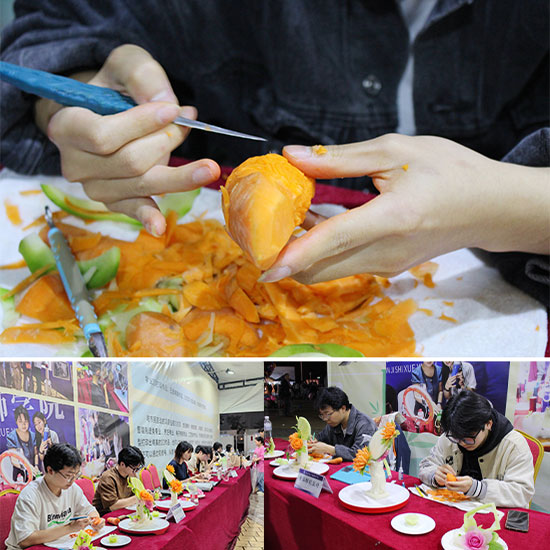 “一刀一錐,靈動(dòng)魚(yú)兒游于股掌;一心一意,食雕之藝綻放精彩。”烹飪專(zhuān)業(yè)的學(xué)生利用各種蘿卜,雕琢出的紫紅色花朵栩栩如生。許多熱愛(ài)烹飪的大朋友、小朋友也親自上手體驗(yàn)了一把制作精美食材的過(guò)程。許多游客駐足拍照,在切、刻、雕、接等手法的綜合運(yùn)用中,學(xué)校學(xué)生與體驗(yàn)者積極互動(dòng),共同創(chuàng)作出了精美的成品。
