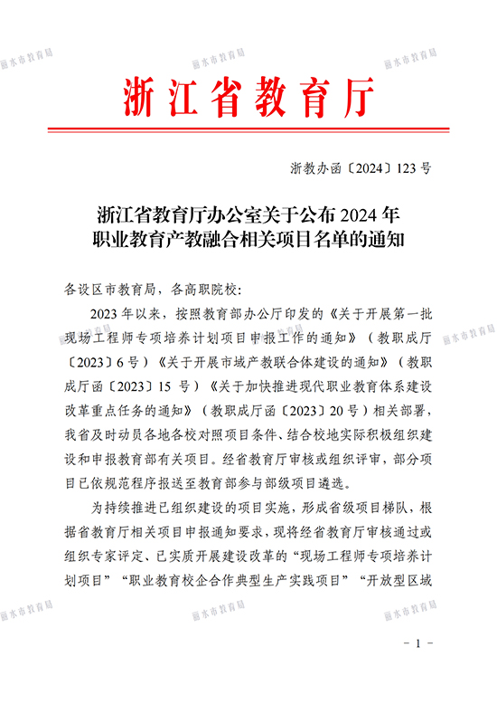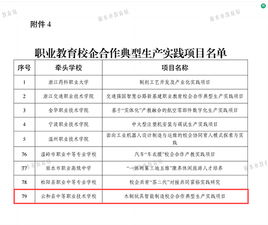 近日,浙江省教育廳辦公室公布2024年職業教育產教融合相關項目名單。云和縣中等職業技術學校申報的2個項目成功入選:“木制玩具智能制造校企合作典型生產實踐項目”入選職業教育校企合作典型生產實踐項目名單,“木制玩具制作開放型區域產教融合實踐中心”入選開放型區域產教融合實踐中心名單。