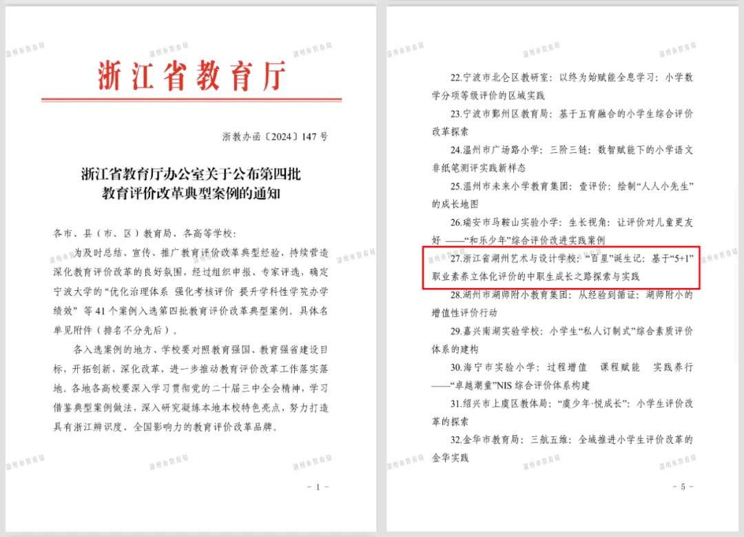 近日,浙江省教育廳辦公室公布第四批教育評價改革典型案例,浙江省湖州藝術(shù)與設(shè)計學(xué)校報送的案例《“百星”誕生記:基于“5+1” 職業(yè)素養(yǎng)立體化評價的中職生成長之路探索與實踐》成功入選,也是本次全省唯一入選的中職學(xué)校教育評價改革典型案例。