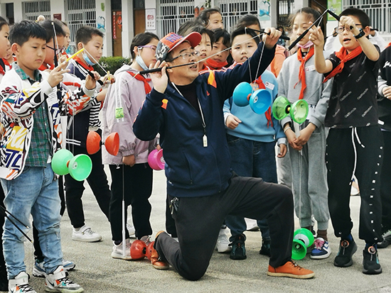 “抖”進校園,陽光氣象。抖空竹對青少年兒童而言,通過視線追蹤,提高眼神經的靈敏度,保護提升視力。該運動寓教于樂,既有利于提高學生心肺功能,又能使其保持精神愉快,提高食欲。“抖空竹”開展以來,深受學生喜愛,于是江禮軍走進綠城育華國際學校、舟山一小、南海實驗學校惠民橋小學、白泉小學、岑港小學等十余所學校開課傳授。在授課中,除了教授動作技巧,還讓學生了解非物質文化遺產的內涵,建立傳承和保護優秀傳統文化項目的理念。小小空竹讓學生強身健體,讓學校到處洋溢著健康氣息。