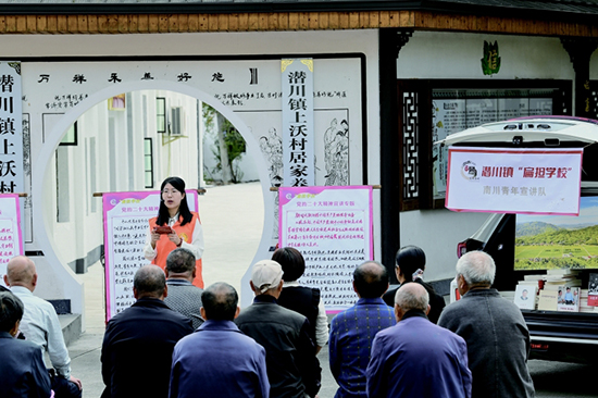 “扁擔學校”堅持雙腳走,走街串巷,走鄉間村道,走進大山。貼近農村實際,結合地方時事政策,助力政府政策推進,2018年潛川鎮小城鎮環境綜合整治,2019年潛川鎮“百日大攻堅爭創示范村”全域拆整行動、2020年的村級組織換屆選舉紀律,2021年的疫情防控政策,2022年的美麗城鎮建設,2023年的做好亞運東道主等內容也成為宣講隊的重要宣傳內容。宣講隊兼具收集民意、反映民聲的功能,逐漸成為黨委政府與群眾之間的“溝通橋梁”,有效打通基層宣傳“最后一公里”,讓老百姓在家門口就能深入學習理解黨的政策理論方針。