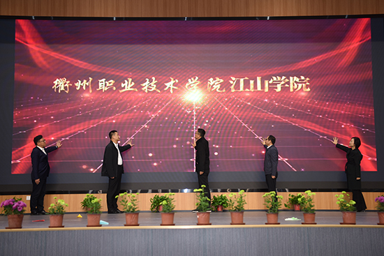 衢州職業技術學院黨委副書記、校長呂延文,衢州市教育局黨委委員、副局長徐豐民,江山市人民政府副市長王展,江山市教育局黨委書記、局長鄭李慧,衢州第二中專黨委書記徐凌志共同為衢州職業技術學院江山學院進行了揭牌儀式。這一儀式的完成,標志著江山學院正式成立,將開啟職業教育的新篇章。