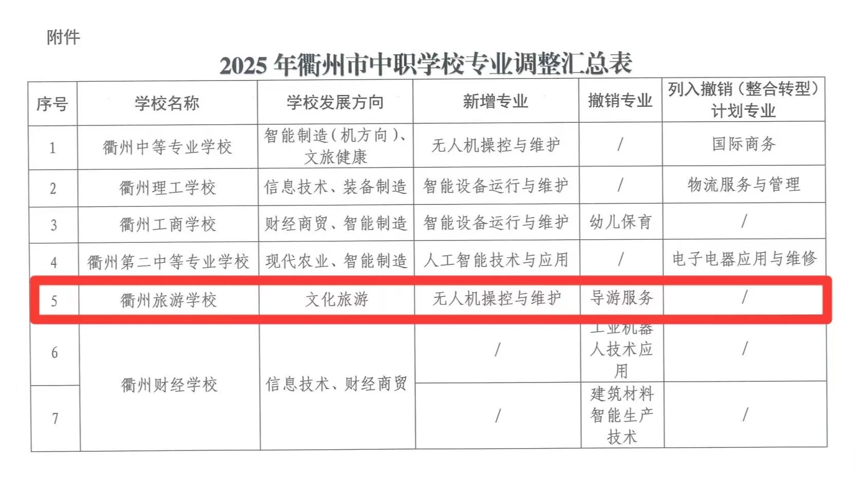 2月20日,衢州市教育局下發(fā)了《關(guān)于公布2025年衢州市中職學(xué)校專(zhuān)業(yè)調(diào)整結(jié)果的通知》(衢教〔2025〕5號(hào))文件,浙江省衢州旅游學(xué)校成功新增無(wú)人機(jī)操控與維護(hù)專(zhuān)業(yè)。
