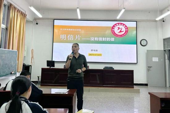 本次講座特邀慶元職高集郵協會輔導員廖瑞新老師擔任主講人。講座中,廖瑞新從明信片的基本常識、歷史起源、種類劃分等八個方面,向同學們系統介紹了明信片的文化內涵和藝術價值。通過生動的講解和豐富的實物展示,同學們不僅了解了明信片的發展歷程,還感受到了小小紙片背后承載的歷史記憶和人文情懷。