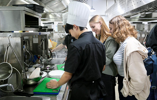 在隨后的參觀環(huán)節(jié)中,德國師生們深度體驗(yàn)了學(xué)校的特色課程與文化:步入一樓展廳,工美專業(yè)學(xué)生創(chuàng)作的藝術(shù)作品以精巧的工藝與創(chuàng)意吸引眾人駐足;走進(jìn)23西餐班的實(shí)訓(xùn)課堂,同學(xué)們現(xiàn)場展示地道的西餐制作技藝,從食材處理到擺盤裝飾,盡顯匠心;于米塑非遺館內(nèi),師生們近距離感受傳統(tǒng)工藝的魅力,細(xì)膩逼真的米塑作品令人贊嘆不已;在甌菜研究所,大家還領(lǐng)略了傳統(tǒng)溫州特色年夜飯的獨(dú)特風(fēng)味與文化內(nèi)涵,沉浸式體驗(yàn)了中國飲食文化的博大精深。