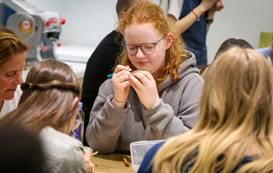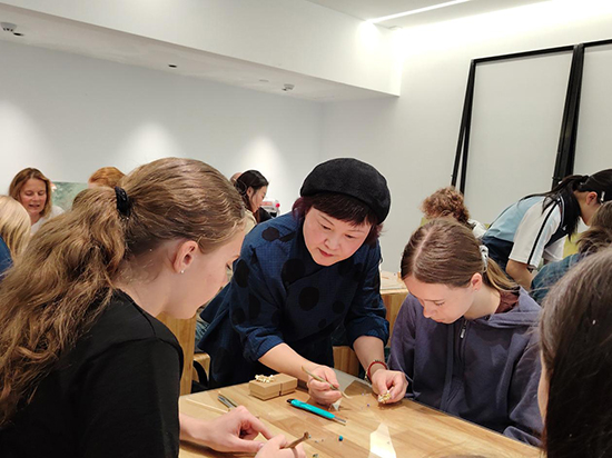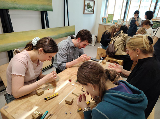 特別值得一提的是,在甌塑非遺傳承大師單曼曼的悉心指導(dǎo)下,德國師生們親手拿起塑形工具,沉浸式體驗(yàn)甌塑制作的獨(dú)特魅力。從揉捻彩色油泥,到勾勒山水紋樣,指尖的藝術(shù)跨越語言隔閡。24工美2班的學(xué)生志愿者們?nèi)棠托膮f(xié)助,以熱情的交流,搭建起藝術(shù)溝通的橋梁。