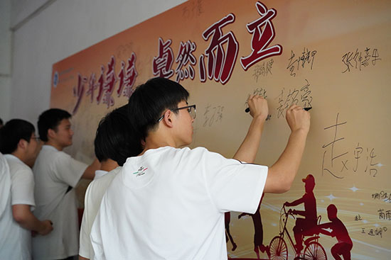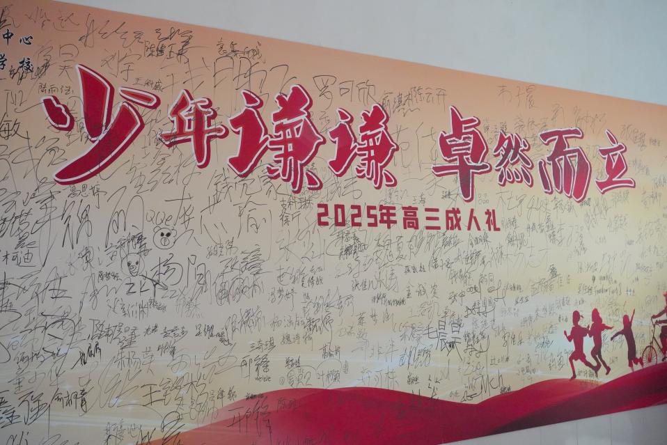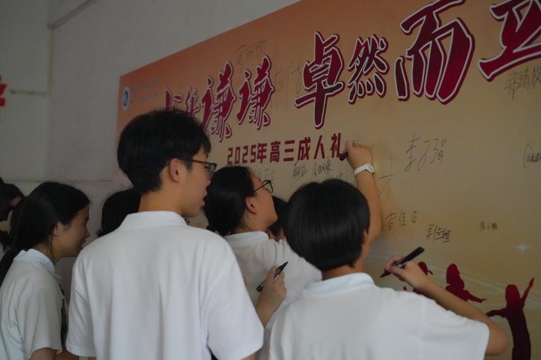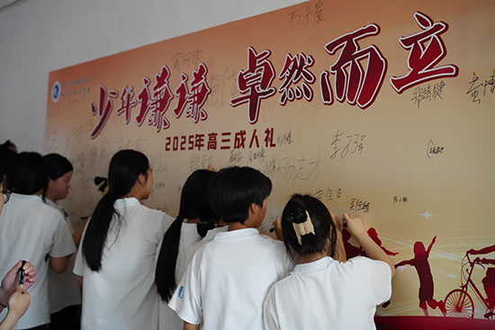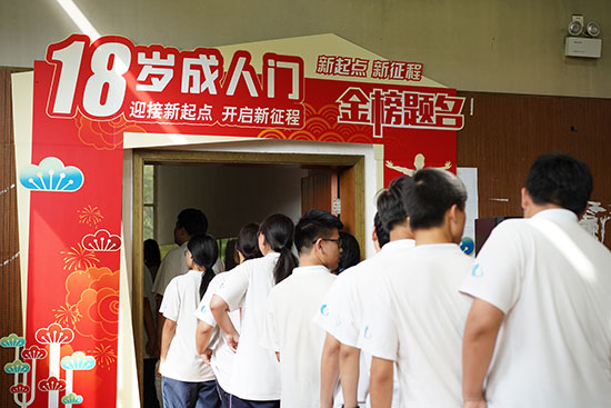 宣誓環節,同學們面向國旗鄭重宣誓:立志成為有理想、有道德、有文化、有紀律的社會主義公民。最后,在老師和家長們的殷切目光下,同學們依次走過成人門,在簽字版上寫下自己的名字,宣告自己已長大成人,正式跨入了成年人的行列。
