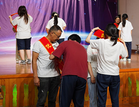 22創新學前班商雨晗同學的媽媽欣喜地分享著孩子的成長,也祝福在場的每一位同學未來的人生之路能夠充滿陽光、充滿希望、充滿幸福。紙短情長,舐犢情深。同學們用詩歌朗誦禮贊青春,并親手為父母系上象征感恩與承諾的紅色飄帶。一個深情的擁抱,串聯起兩代人之間的深情與希冀,更傳遞著學子們“以青春之名,擔時代之責”的堅定信念。
