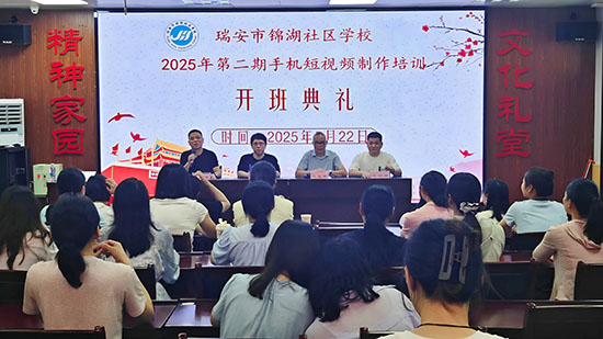 5月22日上午,瑞安市錦湖社區學校多功能廳內座無虛席,由該校與溫州市弘澤職業技能培訓學校聯合舉辦的第二期短視頻制作專項技能培訓班正式開班。瑞安市錦湖街道社會事務辦副主任狄益斌、溫州市弘澤職業技能培訓學校校長陳玲福、鹿城區職業技能帶頭人馬千駿等嘉賓出席開班儀式,錦湖社區學校常務副校長張再益主持典禮,轄區80余名學員共同開啟數字技能提升新征程。