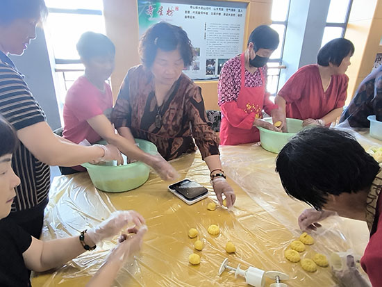 在實踐環節,社區工作人員提前備好低糖綠豆粉、模具及包裝禮盒,老人們戴上手套,化身“糕點師”。成校老師分組示范,從揉搓綠豆團到壓模定型,手把手指導細節。72歲的李奶奶與鄰居搭檔協作,一邊將綠豆泥填入蓮花紋模具,一邊笑道:“年輕時忙工作,現在和老姐妹一起做糕點,這可比買的有意義!”活動現場歡聲不斷,綠豆清香彌漫,不一會兒,蓮蓬、如意等造型精致的綠豆糕便擺滿桌案。