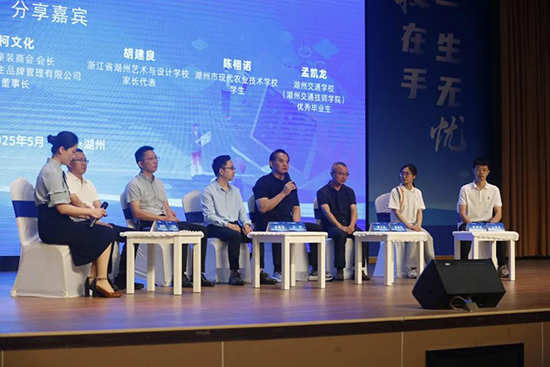 "職業教育助力多元成才"沙龍活動中,來自初中學校、職業院校、企業的代表們圍繞職業教育發展進行了深入交流,分享了各自的經驗與見解。學校邀請的織里童裝商會會長、湖州男生女生品牌管理有限公司董事長柯文化暢談了校企合作的愿景,中本一體化班級家長代表則分享了職教升學的優勢。