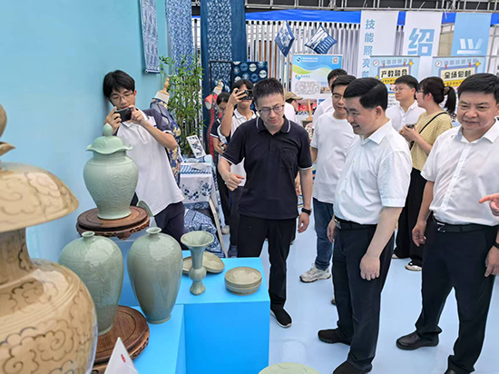展會當天,省人力社保廳黨組書記、廳長吳偉斌,廳黨組副書記、副廳長張旭明等領導蒞臨現場,深入各市級展區考察。在上虞區技工學校展位前,省市領導饒有興致地駐足,詳細聽取了學校參展作品的介紹。吳偉斌廳長對學校將人工智能融入技能教學的實踐模式表示高度贊賞,更對傳統與現代創意兼具的越窯青瓷作品贊嘆不已,充分肯定了學校專業建設方面取得的成效。他鼓勵學校繼續發揮優勢,深化產教融合,為社會培養更多高素質技能人才。