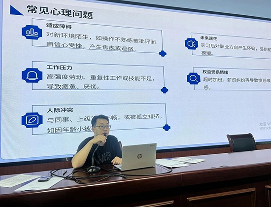 隨后,學校保障處副處長倪豐從嚴守紀律紅線、筑牢安全防線及關注心理健康三大方面對學生進行教育,并提出相關要求。倪豐重點解讀了《實習生頂崗實習期間違紀處理意見》,明確紀律底線;他強調安全是重中之重,以真實的案例來警示學生在實習期間注意生產安全、交通安全的重要性,警惕詐騙。他表示,如學生在實習期出現心理困擾,可及時聯系班主任,積極尋求幫助。
