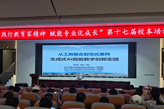 下午場(chǎng)以一場(chǎng)充滿未來(lái)感的AI講座開啟。來(lái)自浙工大的李浩君教授帶來(lái)《從工具整合到范式重構(gòu):生成式AI賦能教學(xué)創(chuàng)新實(shí)踐》講座。