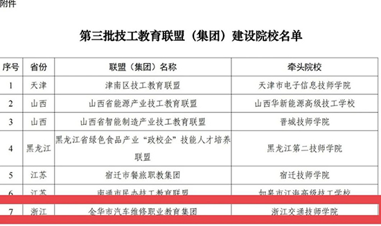 近日,人力資源和社會保障部公布第三批技工教育聯盟(集團)建設院校名單,浙江交通技師學院牽頭組建的“金華市汽車維修職業教育集團”成功入選,成為全國第三批33所技工教育聯盟(集團)建設院校之一。這是學校自2011年創建該職教集團以來,持續深化產教融合、創新集團化辦學的新的里程碑,標志著學校在服務國家技能人才培養、示范引領區域技工教育高質量發展上取得國家級認可。