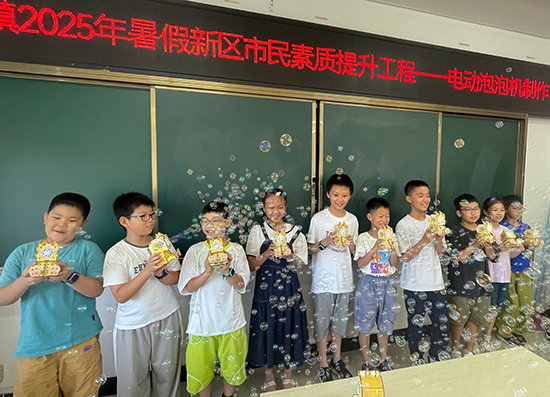 首日的課堂化作夢(mèng)幻工坊。孩子們?cè)诶蠋煄ьI(lǐng)下,將馬達(dá)、電池盒、小風(fēng)扇與泡泡液巧妙組裝,一個(gè)個(gè)親手制作的電動(dòng)泡泡機(jī)陸續(xù)誕生。當(dāng)按下開關(guān),連綿的七彩泡泡輕盈旋舞時(shí),孩子們?nèi)杠S歡呼。這不僅是童趣的綻放,更是電學(xué)知識(shí)的生動(dòng)啟蒙。“原來小馬達(dá)轉(zhuǎn)起來就能吹出這么多泡泡!”一位滿頭汗珠卻笑容燦爛的孩子興奮地說。他們?cè)谡{(diào)試齒輪轉(zhuǎn)速、調(diào)整扇葉角度中,悄然理解了電能轉(zhuǎn)化與空氣動(dòng)力的基礎(chǔ)原理,科學(xué)的種子隨泡泡一同輕盈升騰。