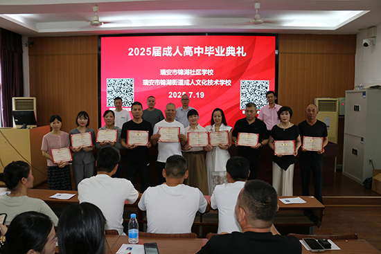 7月19日下午,瑞安市錦湖社區學校文化禮堂國歌嘹亮,莊重開啟2025屆首批成人高中畢業典禮。瑞安市錦湖街道社會事務辦副主任狄益斌、錦湖社區學校副校長(瑞安市職業中等專業教育集團學校總務處主任)謝統、教師代表陳震宇、2025屆成人高中班班主任徐定奎等領導嘉賓出席,與111名滿懷喜悅的畢業生齊聚一堂,共慶學業有成。典禮由常務副校長張再益主持,現場氛圍熱烈而莊重。