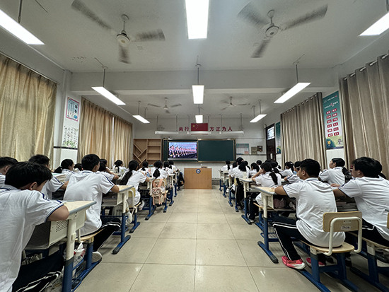 觀禮開始前,班主任們已將“技能筑夢,強國有我”任務單分發到每位學生手中。直播開啟的瞬間,教室里瞬間安靜下來,唯有屏幕中傳來的激昂樂曲與鏗鏘步伐回蕩。部分班級更以沉浸式方式參與其中,跟隨直播旋律齊聲奏唱國歌,嘹亮的歌聲里滿是對祖國的赤誠與敬意。