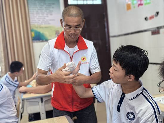 理論講解結(jié)束后,實(shí)操練習(xí)隨即啟動(dòng)。同學(xué)們兩兩一組,互相充當(dāng) “傷員” 進(jìn)行包扎練習(xí):從頭部環(huán)形包扎到手臂螺旋包扎,從腿部“8”字包扎到關(guān)節(jié)處的特殊包扎,大家認(rèn)真模仿講師動(dòng)作,不斷調(diào)整包扎松緊度,在實(shí)踐中熟悉操作要領(lǐng)。