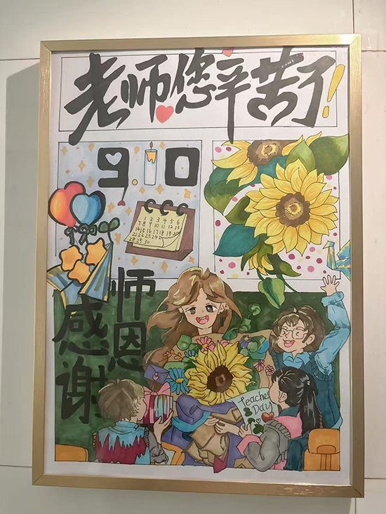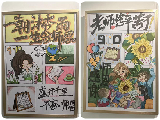 師生餐廳樓梯墻面裝飾了由同學(xué)們親手繪制的祝福卡片。一張張卡片色彩鮮明、筆觸真摯,無(wú)聲傳遞著莘莘學(xué)子對(duì)老師的深厚情誼。活動(dòng)期間,許多教師駐足細(xì)看,在圖文之間感受來(lái)自學(xué)生的真誠(chéng)祝福。