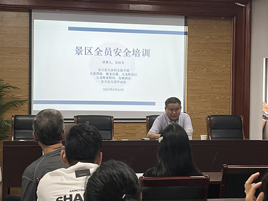9月23日下午3時(shí),在今年國(guó)慶“十一”黃金周到來(lái)前夕,由安吉縣大余村文旅專(zhuān)班和安吉縣社區(qū)教育學(xué)院天荒坪分院(天荒坪成校)聯(lián)合開(kāi)展的藏龍百瀑等景區(qū)(酒店)員工全員安全培訓(xùn)在大溪村村委會(huì)三樓會(huì)議室舉行。
