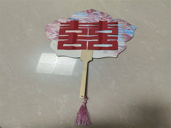 學(xué)員們熱情高漲,紛紛拿起剪刀嘗試。有的學(xué)員專注于傳統(tǒng)“喜”字的精準裁剪,力求展現(xiàn)經(jīng)典紋樣的對稱之美;有的學(xué)員則大膽創(chuàng)新,將安吉本地的竹元素、山水元素融入花紋設(shè)計,讓“喜”字多了幾分地域特色。隨著剪刀的開合,一張張紅紙逐漸變成了造型各異的“喜”字,有的靈動飄逸,有的飽滿厚重。完成剪紙后,學(xué)員們小心翼翼地將“喜”字粘貼在素色扇面上,原本樸素的扇子瞬間煥發(fā)生機,紅色的“喜”字與扇面的素雅相得益彰,既保留了剪紙藝術(shù)的傳統(tǒng)韻味,又賦予了扇子文創(chuàng)產(chǎn)品的實用價值,真正實現(xiàn)了“傳統(tǒng)剪紙+現(xiàn)代文創(chuàng)”的完美融合。