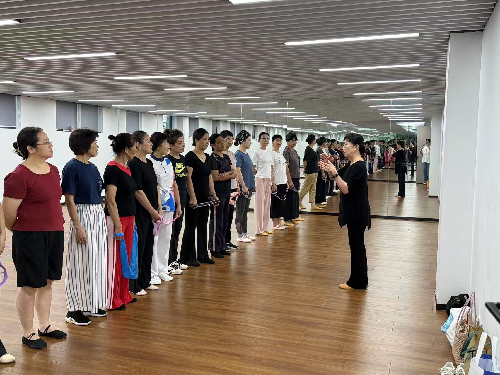 第一堂課,授課的王老師立足老年學員身體特點與學習需求,將 “夯實基礎、做好熱身” 作為開課重點。她詳細示范關節活動、肢體拉伸等熱身動作,逐一向學員講解動作要領,引導學員從規范基礎動作學起,養成科學練習的習慣。學員們精神飽滿,認真跟隨老師示范練習。