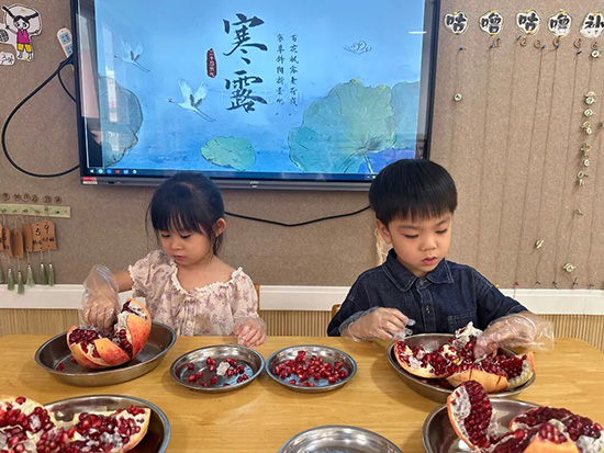 石榴是寒露時節的“時令寵兒”,不僅果肉酸甜、能喚醒食欲,更富含維生素C與B2,兼具美味與營養。中班的孩子們化身“小小營養師”,動手制作“秋天的第一杯石榴汁”:先將飽滿的石榴清洗干凈,小心翼翼剝出晶瑩的籽兒;再把籽兒裝進保鮮袋,用碾棍反復碾壓出汁液;最后將清甜的汁水倒入杯中——舉起杯子輕輕干杯,舌尖的甜意與臉上的笑容,成了這個秋天最治愈的味道。