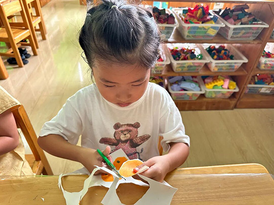 秋日雖有萬物凋零的詩意,卻也藏著柿子的熱烈——枝頭那一串串紅燈籠,成了最動人的秋日符號。大班幼兒以“柿”為媒,創作“柿柿如意”主題畫:先用棕色卡紙勾勒出質樸的籃子,剪下粘貼在白紙上;再用紅色、黃色的筆現出一個個圓潤的柿子剪下,輕輕貼進“籃筐”。當最后一個“柿子”落定,一張張滿載美好寓意的作品新鮮出爐,也將秋日的甜意定格在紙上。