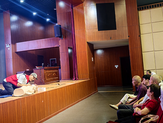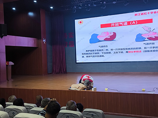 培訓現(xiàn)場,來自浙江省紅十字會一級應急救護師丁柏偉講師結合日常生活中可能遇到的突發(fā)狀況,深入淺出地講解了掌握應急救護知識的重要性。丁講師重點圍繞心肺復蘇術(CPR)進行了系統(tǒng)教學,內容涵蓋如何快速判斷患者意識和呼吸狀態(tài)、如何正確進行呼救、胸外按壓的關鍵步驟(包括按壓部位、深度、頻率和力度的精準把握)、開放氣道的方法以及實施人工呼吸的有效技巧。講解過程中,講師通過生動的案例剖析,強調了“黃金四分鐘”對于挽救心臟驟停患者生命的決定性意義。